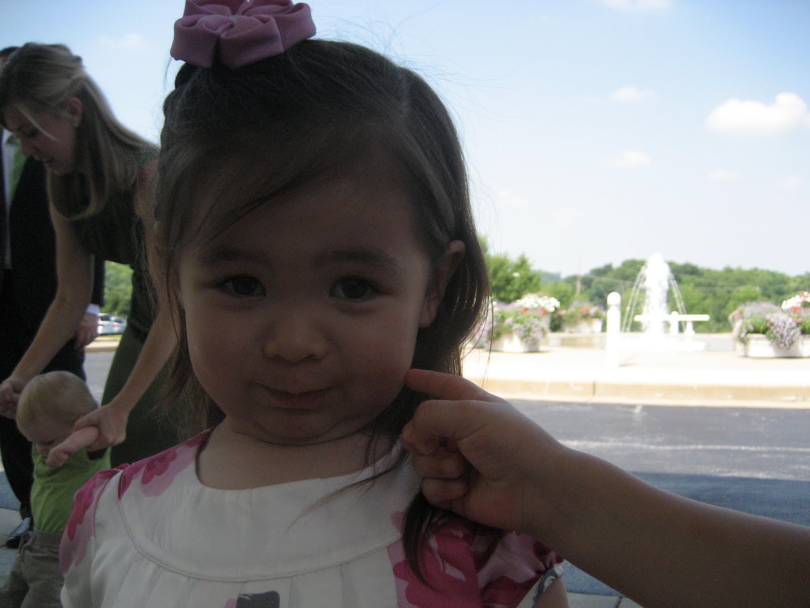 We were all color coordinated that day =). I made flower clips for the older girls and a dress for myself using the same fabric. It matched perfectly with the girls' dresses (the dresses were a gift from my ballet teacher). Then I made a skirt for Eveie and a flower headband to match us. They were so cute! I love having three girls!